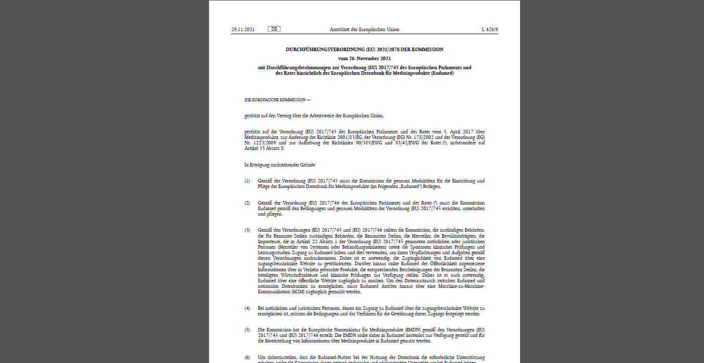 A0108 2021/2078 (EU) − „Europäische Datenbank für Medizinprodukte (Eudamed)" (Durchführungsverordnung)