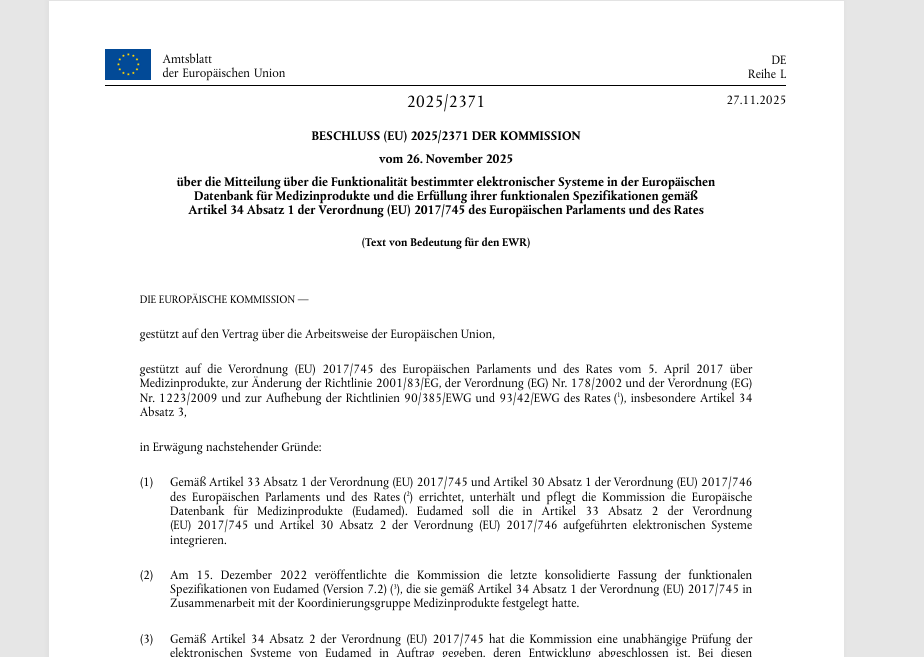 In der Arbeitshilfe finden Sie den Durchführungsbeschluss (EU) Nr. 2025/2371 der Kommission vom 26. November 2025 über die Mitteilung über die Funktionalität bestimmter elektronischer Systeme in der Europäischen Datenbank für Medizinprodukte und die Erfüllung ihrer funktionalen Spezifikationen gemäß Artikel 34 Absatz 1 der Verordnung (EU) 2017/745 des Europäischen Parlaments und des Rates, veröffentlicht im Amtsblatt der Europäischen Union, Reihe L am 27. November 2025. Arbeitshilfen: |