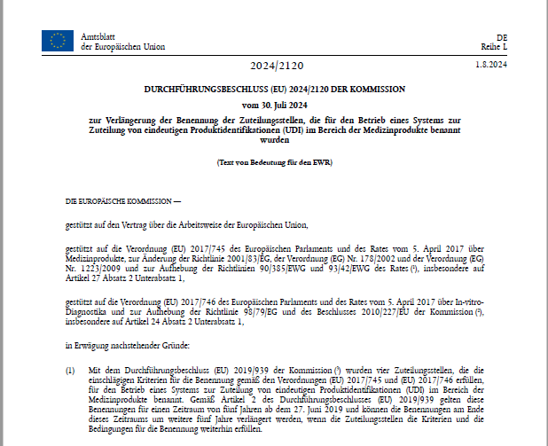 In der Arbeitshilfe finden Sie den Durchführungsbeschluss (EU) Nr. 2024/2120 der Kommission vom 30. Juli 2024 zur Verlängerung der Benennung der Zuteilungsstellen, die für den Betrieb eines Systems zur Zuteilung von eindeutigen Produktidentifikationen (UDI) im Bereich der Medizinprodukte benannt wurden, veröffentlicht im Amtsblatt der Europäischen Union, Reihe L am 1. August 2024.