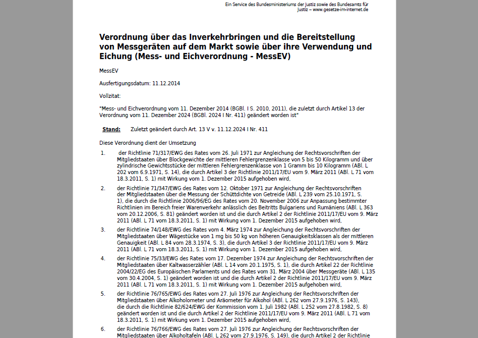In der Arbeitshilfe finden Sie die Mess- und Eichverordnung vom 11. Dezember 2014 (BGBl. I S. 2010, 2011), die zuletzt durch Artikel 13 der Verordnung vom 11. Dezember 2024 (BGBl. 2024 Nr. 411) geändert worden ist.