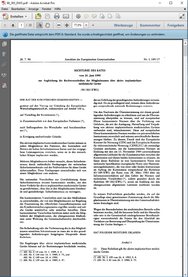 In der Arbeitshilfe finden Sie die Richtlinie des Rates vom 20. Juni 1990 zur Angleichung der Rechtsvorschriften der Mitgliedstaaten über aktive implantierbare medizinische Geräte (90/385/EWG), veröffentlicht im Amtsblatt der Europäischen Union ABl. Nr. L 189 vom 20.07.1990, S. 17