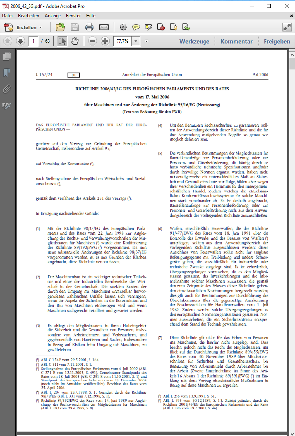 In der Arbeitshilfe finden Sie die Richtlinie 2006/42/EG des Europäischen Parlaments und des Rates vom 17. Mai 2006 über Maschinen und zur Änderung der Richtlinie 95/16/EG (Neufassung), veröffentlicht im Amtsblatt der Europäischen Gemeinschaften ABl. Nr. L 157 vom 09.06.2006, S. 24. Arbeitshilfen: |