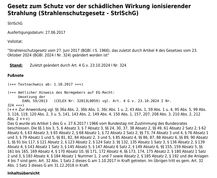 In der Arbeitshilfe finden Sie das Strahlenschutzgesetz vom 27. Juni 2017 (BGBl. I S. 1966), das zuletzt durch Artikel 4 des Gesetzes vom 23. Oktober 2024 (BGBl. 2024 I Nr. 324) geändert worden ist.