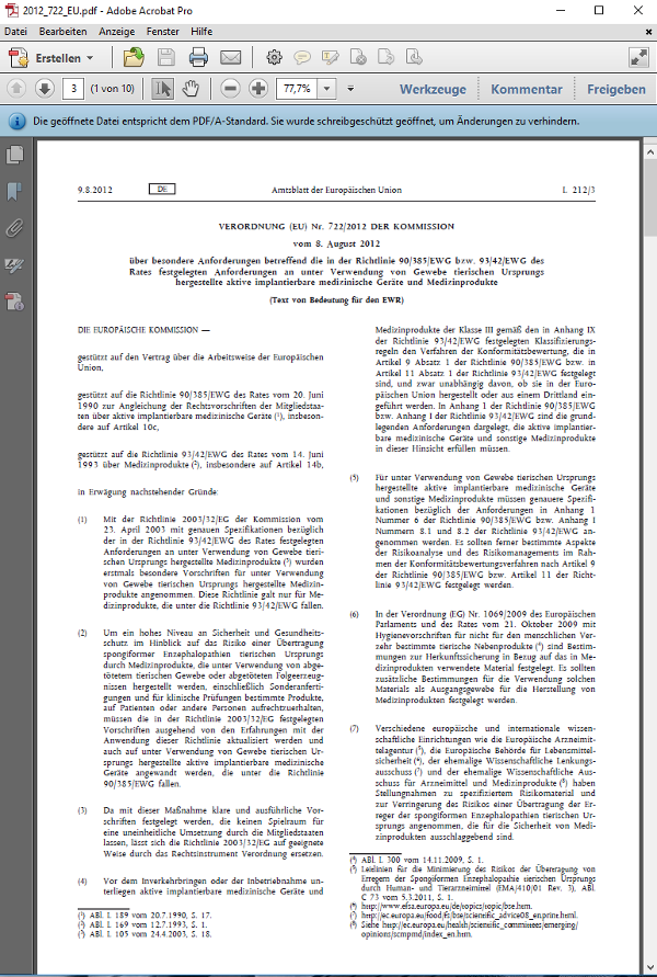 A0104 722/2012 (EU) „Verwendung von Gewebe tierischen Ursprungs” (Verordnung)