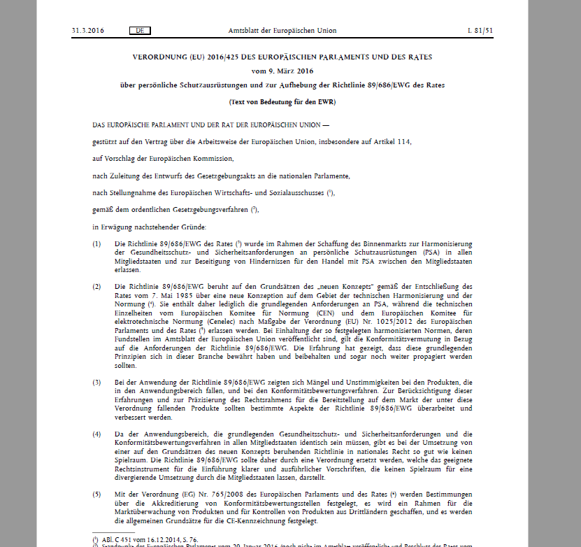 In der Arbeitshilfe finden Sie die Verordnung des europäischen Parlaments und des Rates vom 9. März 2016 über persönliche Schutzausrüstungen (2016/425/EU), veröffentlicht im Amtsblatt der Europäischen Gemeinschaften ABl. Nr. L 81 vom 31.03.2016, S. 51. Arbeitshilfen: |